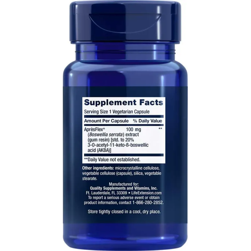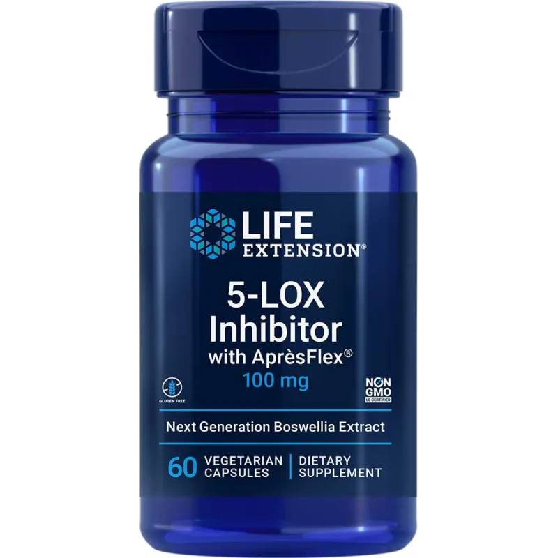 Boswellia ist ein Extrakt, der Entzündungsfaktoren hemmen kann, um die Gesundheit von Gelenken und Arterien zu unterstützen. In dieser Ergänzung verwenden wir eine standardisierte Form von Boswellia namens AprèsFlex®, die 52 Prozent mehr in das Blut aufnimmt als bisher verfügbare Boswellia-Extrakte. Jede vegetarische Kapsel 5-LOX-Inhibitor mit AprèsFlex® enthält 100 mg dieses innovativen Extrakts.