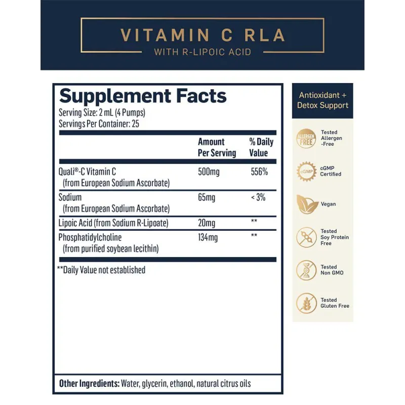Zutaten: Wasser, Natrium-L-Ascorbat (Vitamin C), Stabilisator (Glycerin), Emulgator (Sojalecithine), Ethanol, Natrium-R-Lipoat, Zitronenschalenöl (Citrus limon) |