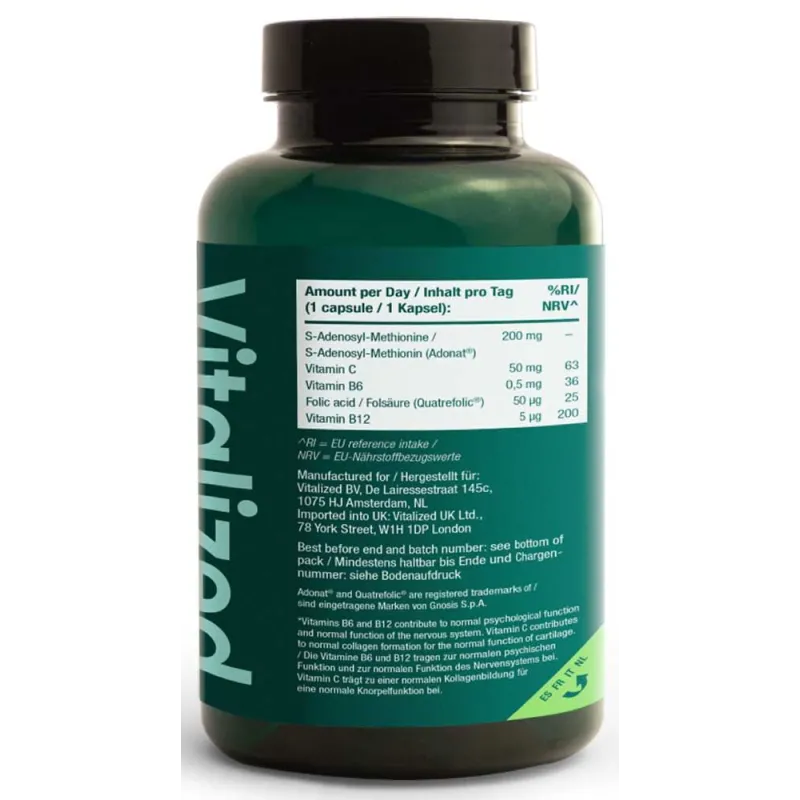 Vitalized SAMe+ 200 mg unterstützt das Wohlbefinden, die Gesundheit der Gelenke und die Entgiftung der Leber. Enthält klinisch untersuchtes SAMe (Adonat®) kombiniert mit den Vitaminen B6, B12, Folsäure (Quatrefolic®) und Vitamin C – alles in einer veganen Kapsel mit verzögerter Freisetzung.