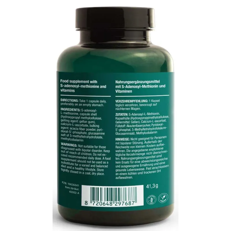 ZUTATEN: S-Adenosyl-L-Methionin, Kapselhülle (Hydroxypropylmethylcellulose, Geliermittel: Gellan), Calcium-L-ascorbat, Füllstoff: Akazienfaserpulver, Pyridoxal-5'-phosphat, 5-Methyltetrahydrofolsäure-Glucosaminsalz, Methylcobalamin |
