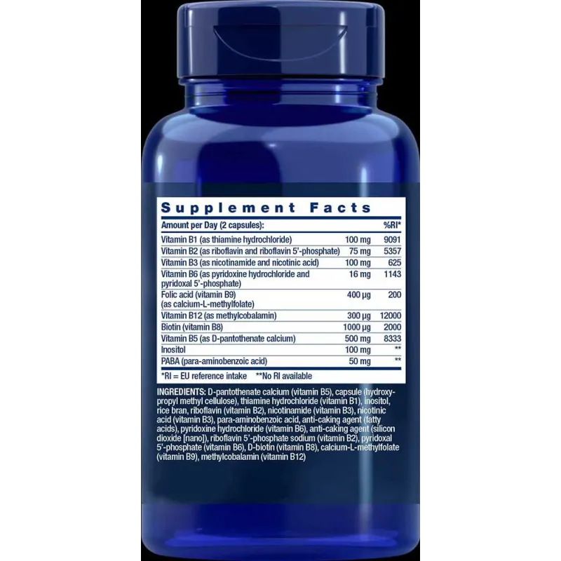 Zutaten: D-Pantothenat, Calcium (Vitamin B5), Kapsel (Hydroxypropylmethylcellulose), Thiaminhydrochlorid (Vitamin B1), Inositol, Reiskleie, Riboflavin (Vitamin B2), Nicotinamid (Vitamin B3), Nicotinsäure (Vitamin B3), para-Aminobenzoesäure , Trennmittel (Fettsäuren), Pyridoxinhydrochlorid (Vitamin B6), Trennmittel (Siliciumdioxid [Nano]), Riboflavin-5'-phosphat, Natrium (Vitamin B2), Pyridoxal-5'-phosphat (Vitamin B6) , D-Biotin (Vitamin B8), Calcium-L-Methylfolat (Vitamin B9), Methylcobalamin (Vitamin B12)