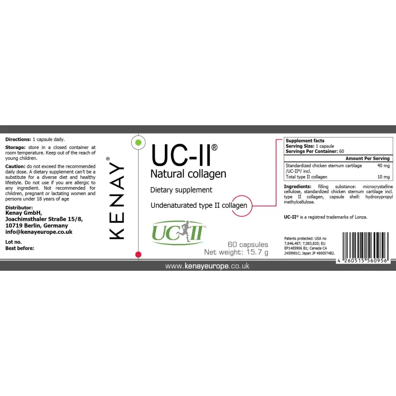 Το Κολλαγόνο UC-II περιέχει μια κατοχυρωμένη με δίπλωμα ευρεσιτεχνίας μορφή μη αποκορυφωμένου κολλαγόνου τύπου II που προέρχεται από το στέρνο κοτόπουλου. Το UC-II Κολλαγόνο προστατεύει από την αρθρίτιδα καθώς και ανακουφίζει από τον πόνο της οστεοαρθρίτιδας. Επιπλέον, αυτό το μη αποκορυφωμένο κολλαγόνο τύπου II μπορεί να ανακουφίσει τον πόνο στις αρθρώσεις και τους μύες και να βελτιώσει την ευλυγισία των αρθρώσεων. Ανακουφίζει επίσης τον πόνο στις αρθρώσεις που προκαλείται από την άσκηση. [1,2]
