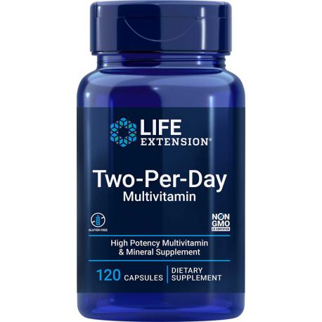 Οι κάψουλες Two-Per-Day μας, χωρίς σόγια, περιέχουν τη βιοενεργή μορφή του φολικού οξέος βιταμίνης Β, 5-MTHF· κιτρικό ψευδάργυρο· τη μικτή μορφή τοκοφερόλης της βιταμίνης Ε, και πολλά άλλα. Επωφεληθείτε στο έπακρο από τη πολυβιταμίνη σας με τις κάψουλες Life Extension Two-Per-Day.
