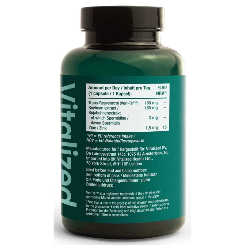 Η φόρμουλα της Vitalized παρέχει 3 mg σπερμιδίνης από εκχύλισμα σόγιας και μια επιστημονικά αποδεδειγμένη δόση 150 mg καθαρής, υψηλής ποιότητας ρεσβερατρόλης Veri-te™ ανά ημερήσια μερίδα.