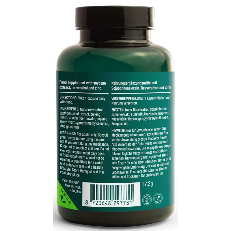 Συστατικά: Trans-ρεσβερατρόλη, εκχύλισμα σπόρων σόγιας, διογκωτικός παράγοντας: σκόνη ινών ακακίας, κέλυφος κάψουλας: υδροξυπροπυλομεθυλοκυτταρίνη, γλυκονικός ψευδάργυρος. |