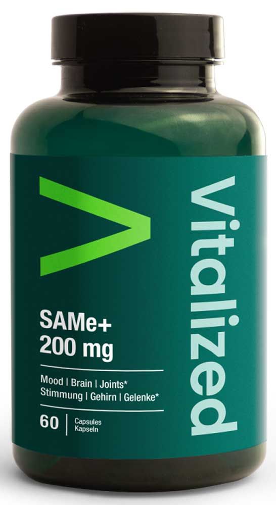 Vitalized SAMe+ 200 mg supports well-being, joint health, and liver detoxification. Provides clinically studied SAMe (Adonat®) combined with vitamins B6, B12, folic acid (Quatrefolic®), and vitamin C – all in one vegan slow-release capsule.