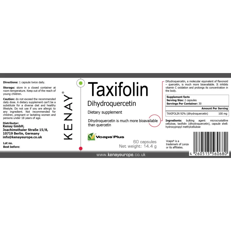 Ingredientes: agente de carga: celulosa microcristalina, taxifolina (dihidroquercetina), cubierta de la cápsula: hidroxipropilmetilcelulosa. |