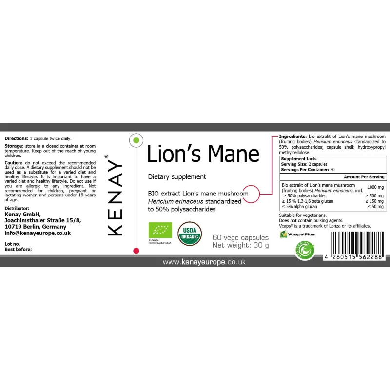 Ingredientes: bioextracto de extracto de hongo melena de león (cuerpos fructíferos) Hericium erinaceus estandarizado al 50% de polisacáridos; cubierta de la cápsula: hidroxipropilmetilcelulosa. |
