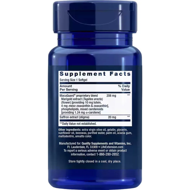 Soporte Ocular MacuGuard® con Azafrán proporciona luteína, trans-zeaxantina y meso-zeaxantina, tres nutrientes importantes que protegen las delicadas células fotorreceptoras en la mácula de la retina del daño de la luz.Beneficios de un vistazo: