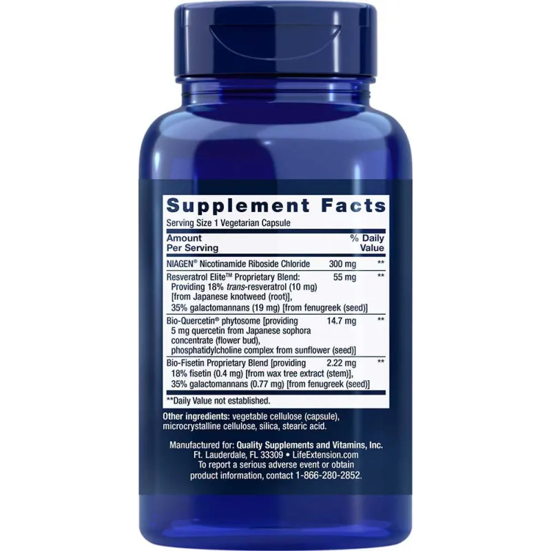 Esta fórmula también contiene fisetina y quercetina, compuestos de fitonutrientes que aumentan los efectos saludables del resveratrol, promueven la salud cardiovascular, respaldan la función celular y mitocondrial saludable, reducen el estrés oxidativo, promueven una respuesta inflamatoria saludable y más.