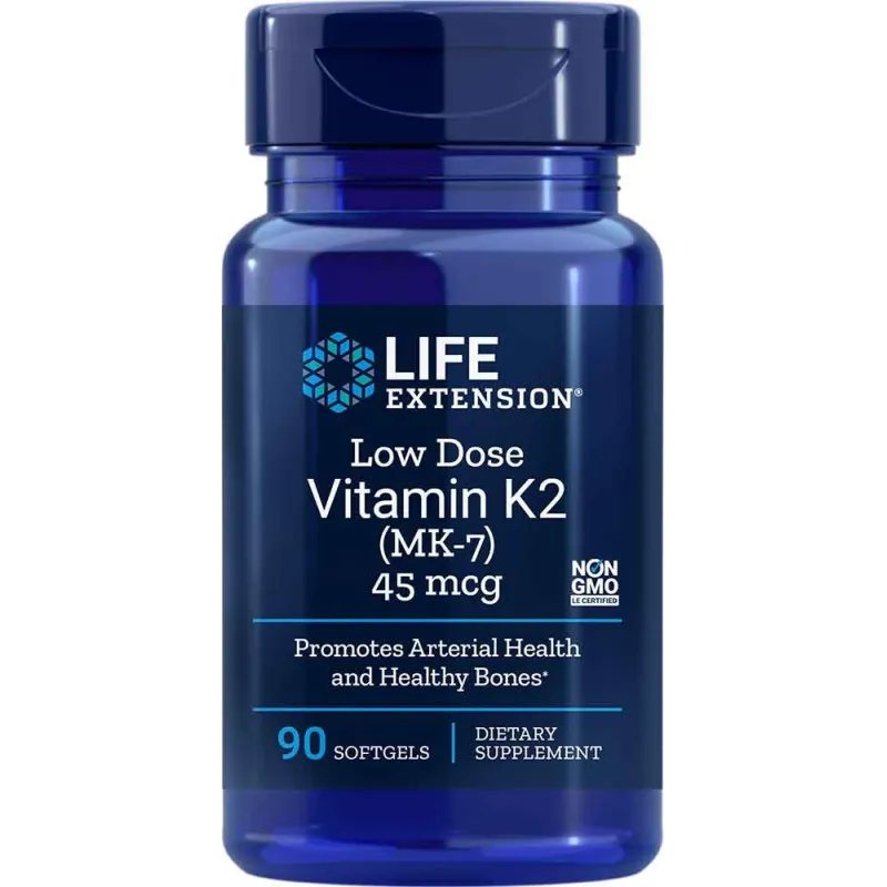 Dosis bajas de vitamina K2 (MK-7) contiene la forma menaquinona-7 de vitamina K2, que no se metaboliza rápidamente en el hígado, por lo que está disponible para proporcionar un suministro más constante de vitamina K al cuerpo.