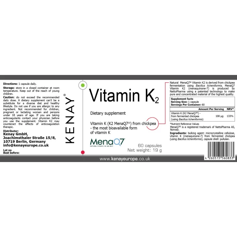 Ingredienti: agente di carica: cellulosa microcristallina, vitamina K (menachinone-7) da ceci fermentati (utilizzando Bacillus licheniformis), involucro della capsula: pullulan. |