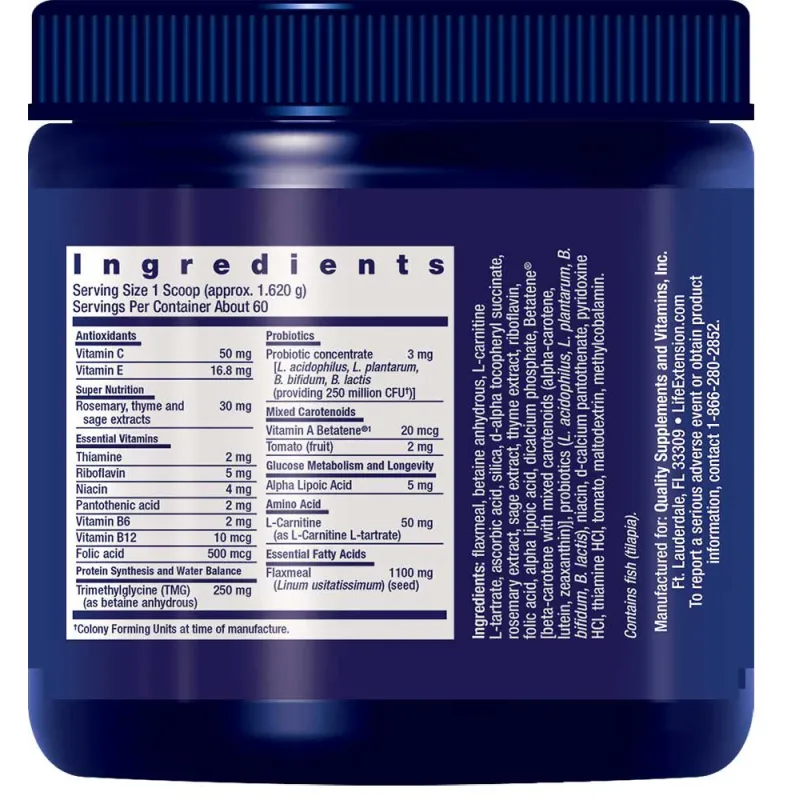 Składniki: mączka z siemienia lnianego, betaina bezwodna, L-winian L-karnityny, kwas askorbinowy, krzemionka, bursztynian d-alfa tokoferylu, ekstrakt z rozmarynu, ekstrakt z szałwii, ekstrakt z tymianku, ryboflawina, kwas foliowy, kwas alfa liponowy, fosforan diwapniowy, Betatene® [beta -karoten z mieszanymi karotenoidami (alfa-karoten, luteina, zeaksantyna)], probiotyki (L. acidophilus, L. plantarum, B. bifidum, B. lactis), niacyna, d-pantotenian wapnia, pirydoksyna HCl, tiamina HCl, pomidor, maltodekstryna, metylokobalamina. |